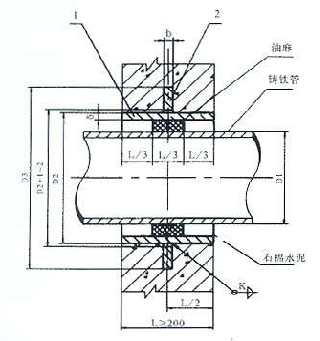2、Ⅱ型剛性防水套管,適用于鑄鐵管,也適用于非金屬管,但應(yīng)根據(jù)采用管材的管壁厚度修正有關(guān)尺寸。